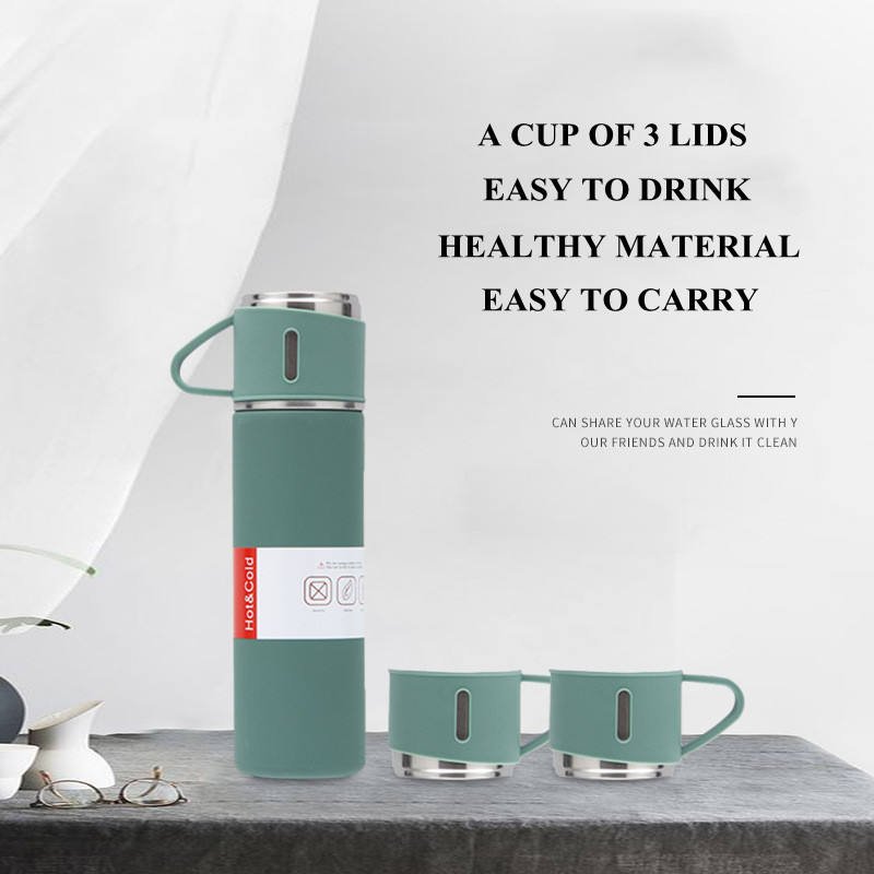 Double Wall Stainless Steel Thermo 500ml Vacuum Insulated Bottle Water Flask Gift Set with Two Cups Hot & Cold | Assorted Color | Diwali Gifts for Employees | Corporate Gift Items